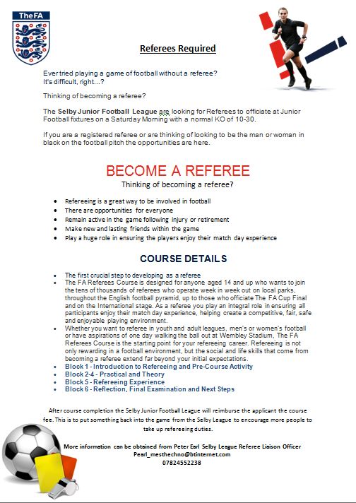 The Selby & District Junior Football League have organised a FREE referee course for anyone who would like to referee in the Selby junior football league